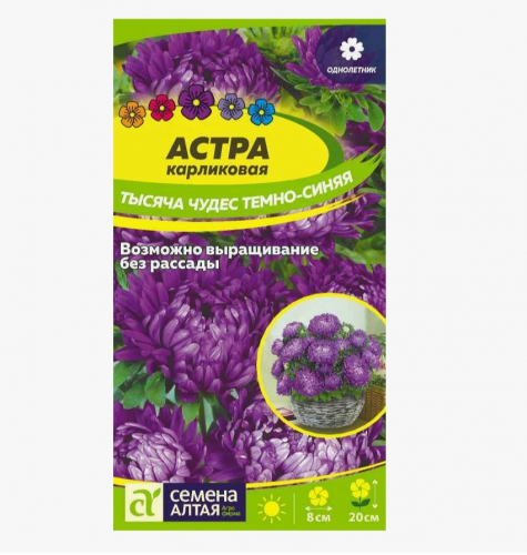Бордюрная низкорослая астра, одна из самых востребованных. Куст высотой до 20 см весь покрыт крупными цветками темно-синей окраски, до 8 см диаметром. Идеально подходит для выращивания в горшечной культуре. Выращивается в смешанных цветниках, партерных клумбах, вазонах, широко используется в качестве бордюрной культуры. Продолжительность цветения с июля до октября. Холодостойкое, светолюбивое растение, выносит полутень. Предпочитает солнечные участки, защищенные от ветра, с легкой плодородной, нейтральной, хорошо дренированной почвой. Кислые почвы необходимо нейтрализовать известью. На рассаду семена высевают в феврале-марте, глубина заделки 0,3-0,5 см. Посевы накрывают пленкой до появления всходов. Через 3 недели от посева, с появлением первой пары настоящих листьев, сеянцы пикируют. В открытый грунт высаживают во второй половине мая, перед высадкой в грунт рассаду закаливают в течение 1-2 недель. Посадочный интервал 20-25 см. Возможен посев семян в открытый грунт в конце апреля (под пленку) или под зиму – во второй половине октября. Подзимние посевы сверху мульчируют торфом или опилками на высоту 3-5 см. Весной посевы раскрывают.