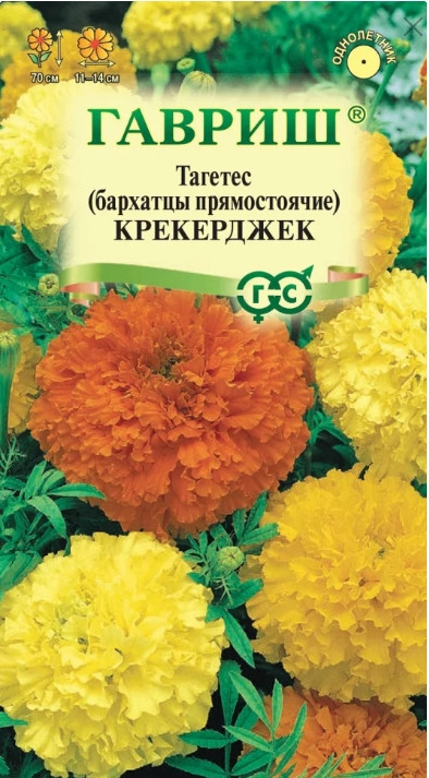 Соцветия крупные (11-14 см в диаметре) густомахровые, оранжевой, золотисто-желтой и лимонно-желтой окраски.