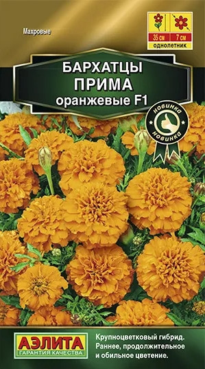 Один из лучших крупноцветковых гибридов бархатцев из серии Прима. Соцветия эффектные, Ø 5-7 см, 100% махровые. Цветение очень раннее и обильное, с самого начала сезона и до заморозков. Кустики пушистые, компактные, до 35 см в высоту. Не вытягиваются, остаются плотными и аккуратными на весь период цветения. Гибрид более устойчив к воздействию дождя и ветра, чем обычные сорта. Не теряет своей декоративности при длительной сырой погоде. Растения отлично подходят для цветников и контейнерной культуры.
