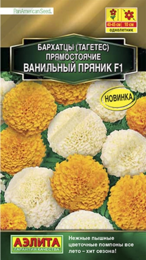Весёлые нарядные окраски в вашем саду! Ванильный пряник - это специально подобранная смесь с выразительными густомахровыми цветками диаметром 7-10 см, созданными словно из взбитых сливок и абрикосового джема. Цветение обильное и продолжительное - вплоть до заморозков. куст высотой до 45 см, шириной не более 25 см, густоветвистый. пушистый за счёт множества красивых сильнорассеченных листьев. Гибриды создадут нежный плотный фон для яркоцветущих культур в среднерослых клумбах, миксбордерах. Кроме того, бархатцы станут украшением садовых вазонов и балконных контейнеров смешанного цветочного состава. Гибриды пригодны для декорации и создания сборных букетов.