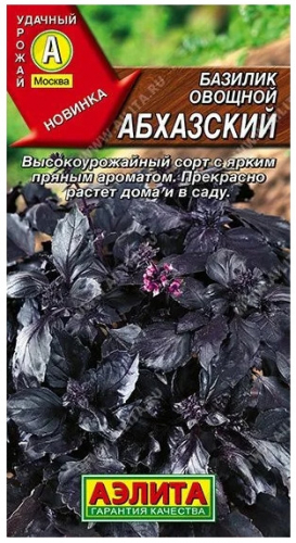 Семена базилика Абхазский — среднеспелый высокоурожайный сорт с ярким пряным ароматом гвоздики. Компактные растения высотой 35-40 см с крупными сладковатыми листьями. Купить семена базилика для домашнего и садового выращивания. Подходит для свежего употребления, сушки, приготовления мясных, рыбных блюд и целебных отваров.