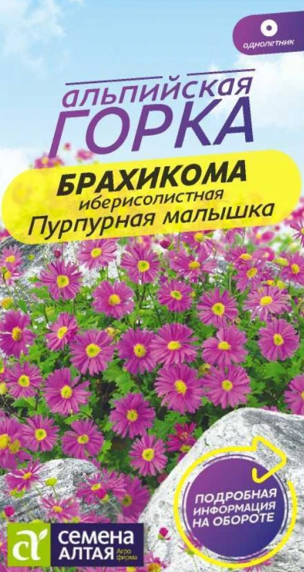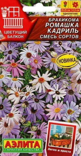 Ветвящийся грациозный многолетник родом из Австралии. В наших широтах выращивают как однолетник. Растение невысокое, до 20 см, легко выращивается и непривередливо в уходе. Стебель сильно ветвится, образуя компактный травянистый кустик. Листья небольшие ажурные мелкорассечённые насыщенно-зеленой окраски. Цветки 2-3 см в поперечнике очень напоминают ромашку, только лепестки окрашены в пурпурный цвет. Великолепное растение для клумб, рабаток, бордюров, каменистых горок.