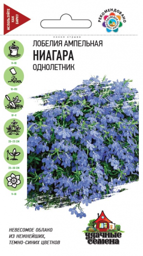 Ранняя серия ампельной лобелии! Растение образует изящный каскад с множеством миниатюрных цветков. Стебли сначала растут вверх, а затем ниспадают. Высота растения 15-20 см. Длина побегов 25-30 см. Окраска небесно-голубая. Великолепно подходит для подвесных корзин, кашпо, балконных ящиков.