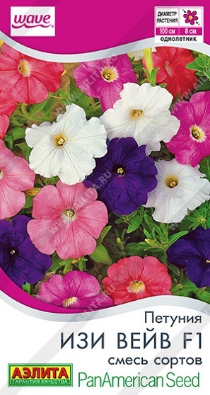 Инновационная эксклюзивная серия американской селекции «Е3 Изи вейв F1». Эти петунии объединили в себе лучшие свойства ампельных, крупно- и многоцветковых разновидностей культуры, что ранее казалось недостижимым. Растение образует очень густой полураскидистый куст  60-80 см (при высоте 15- 30 см). Благодаря целенаправленной селекционной работе цветение гибридов наступает уже при длине дня 9,5 часов и длится до устойчивых осенних заморозков, что значительно сокращает общие затраты при благоустройстве. Насыщенная цветовая гамма крупных цветков (диаметром 6-8 см), необычная полуампельная форма, однородность и выносливость этих растений оставляют позади всех конкурентов. Серия одинаково роскошно выглядит в вазонах и подвесных кашпо, в виде ковровых посадок в цветниках.