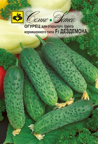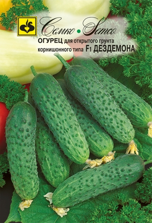 Огурец Дездемона F1 - ранний пчелоопыляемый гибрид для открытого грунта корнишонного типа. От всходов до начала плодоношения 41–45 дней. Растение среднерослое, с хорошим ветвлением. Зеленец крупночастобугорчатый, со сложным опушением, длиной 8–9 см, массой 60–112 г. Огурцы долго не перерастают. Плодоношение регулярное в течение всего вегетационного периода. Вкусовые качества свежих и консервированных огурцов отличные. Товарность высокая, транспортабельный. Огурец Дездемона F1 устойчив к кладоспориозу (Ccu), вирусу огуречной мозаики (CMV), мучнистой росе (Px), толерантен к ложной мучнистой росе (Pcu). Используется для свежего потребления и для консервирования. Рекомендуемая схема посева 70х30 см. Урожайность свыше 10 кг/м.