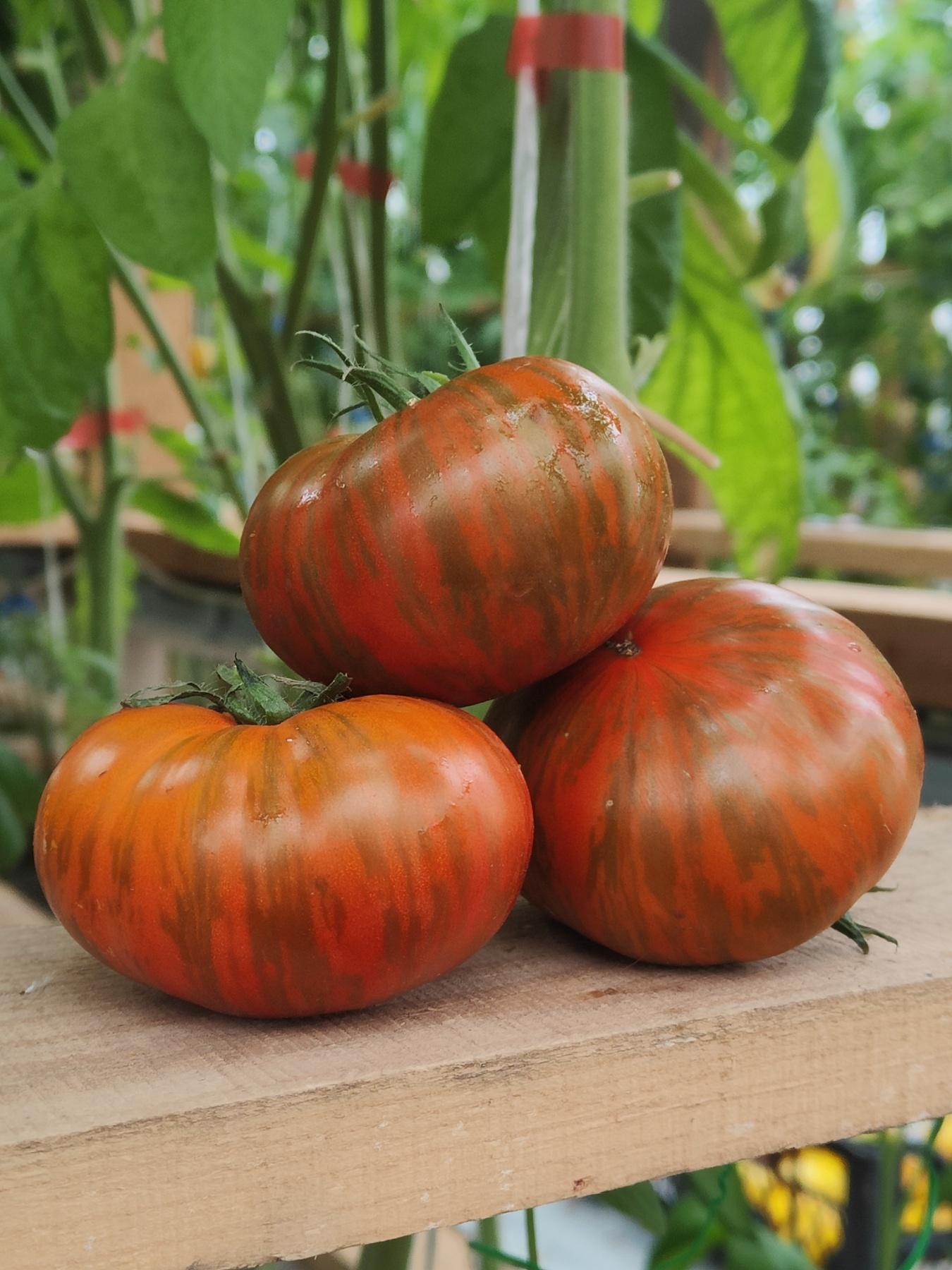 Высокорослый, средне-поздний. Плоды плоскоокруглые, массой 300-400 гр. коричнево-пурпурного цвета с тонкими полосами и штрихами цвета лайма, очень красивые! Мякоть вишневого цвета, плотная, зернистая, сладкая, вкусная. Индет, формировка в 2-3 стебля. Назначение свежее потребление, соки.