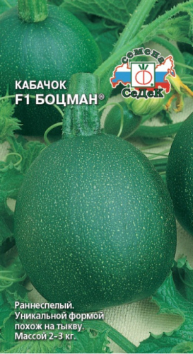 Раннеспелый сорт, вступает в плодоношение на 43-47 день от всходов. Формирует полуплетистые растения с 1-2 укороченными побегами первого порядка. Плоды цилиндрической формы, гладкие, массой 0,7-1,3 кг, темно-зеленые с белой пятнистостью. Мякоть желтая, хрустящая, сочная, с отличными вкусовыми качествами. Прекрасно подходит для повседневной кулинарии и сезонных заготовок на зиму: приготовления икры, маринования, замораживания. Урожайность – 10-12 кг/ м2.