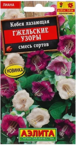 Кобея ползающая или лазающая дает огромное количество побегов, достигает в длину трех метров. Листья в виде перьев с резными складками, на кончиках которых есть усики. Бутоны имеют белый окрас, а как только они распускаются, приобретают фиолетовый оттенок.
