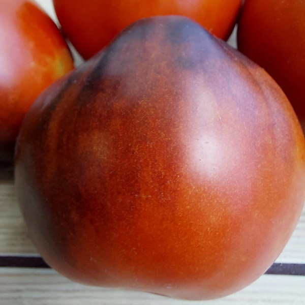 Плоды грушевидные, с ярко выраженной ребристостью, красные с антоциановыми плечиками, мясистые. Их масса 150-250г. Мякоть сахаристая, сладкая. Плоды прекрасно подходят для свежего потребления, салатов, консервирования целыми и кусочками. В кисти по 5-6 плодов. Очень урожайный, среднеспелый сорт, устойчивый и неприхотливый. Кусты мощные, высотой до 1,8м.
