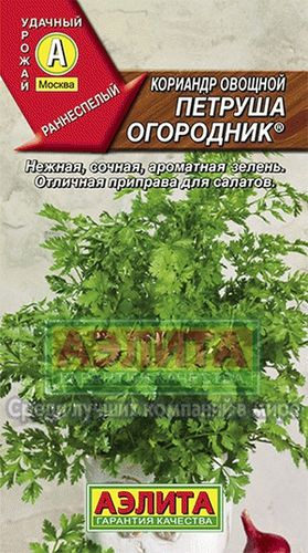 Среднеспелый (30-50 дней от всходов до стеблевания) сорт. Рекомендован для выращивания в открытом грунте на зелень и специи. Розетка листьев приподнятая, хорошо облиственная, полураскидистая, высотой 29 см. Листья зеленые, среднерассеченные, черешок зеленый. Средняя масса розетки 25 г. Растение имеет сильный пряный аромат и приятный нежный вкус. Листья богаты витаминами Е и Р, используются в свежем виде для салатов, в качестве приправы к мясным и рыбным блюдам. Семена добавляют как пряность для ароматизации хлеба, колбас, соусов, кондитерских изделий и в маринады. Высевают в грунт в апреле. Для регулярного сбора зелени посевы повторяют через каждые 2-3 недели. Рекомендуемая схема посева 10х15 см. Средняя урожайность – 1,5 кг/м2.