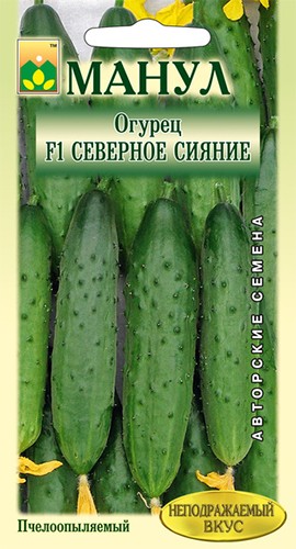 Огурец F1 Северное сияние- основной, урожайный, среднеспелый пчелоопыляемый гибрид с сильным проявлением женского пола. Растения сильнорослые, ветвление среднее. Зеленцы бугорчатые белошипые, длиной16-19 см. Бугорки крупные, частота расположения бугорков редкая. Плоды ярко-зеленой окраски со светлыми продольными полосами. Гибрид с широким оптимальным температурным диапозоном, устойчив к оливковой пятнистости, вирусу обыкновенной огуречной мозаики.