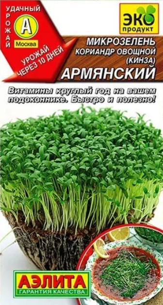 Микрозелень кинзы (кориандра) – это неповторимый пряный аромат и удивительный вкус, который намного приятнее, чем у взрослых растений. При высоте 5-8 см микрозелень можно употреблять не только в срезанном виде, но и целиком, вместе с корешками, предварительно промыв от субстрата. Молодая кинза особенно хороша для витаминных салатов, супов и рыбных блюд, а в некоторых мясных блюдах – абсолютно незаменима. Состав: ко риандр овощной Армянский.В качестве субстрата для выращивания используют грунт для рассады, песок, перлит, бумажные салфетки. Закладывают материал в низкую широкую емкость, увлажняют. Семена равномерно распределяют по поверхности и присыпают тонким (1 мм) слоем пес ка. Накрывают емкость стеклом (пленкой) и держат на свету при комнатной температуре. В фазе одной пары настоящих листочков микрозелень срезают ножницами. Посевы проводят круглогодично.