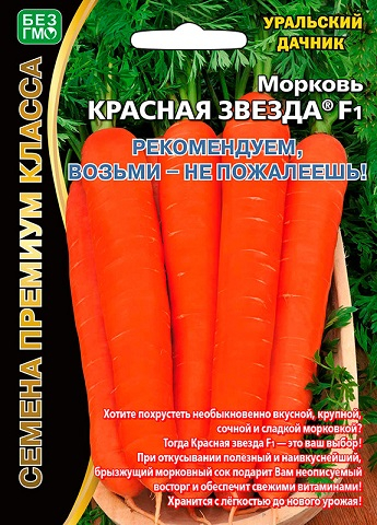 Среднеранний (100 дней) сорт с прочной ботвой и гладкими одинаковыми корнеплодами. Розетка листьев полураскидистая. Корнеплод удлиненно-конический, толстый (сортотип Курода), ровный, оранжевого цвета, длиной 18-20 см. Сердцевина маленькая. Мякоть сочная, ярко-оранжевого цвета. Сорт жаростойкий, устойчив к цветушности и растрескиванию. Урожайность 3,5-4,0 кг/м2.