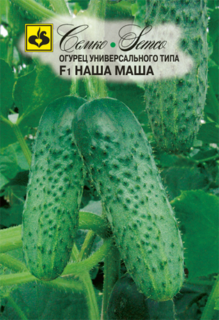 Огурец Наша Маша F1 - ранний партенокарпический гибрид женского типа цветения, рекомендуемый для выращивания в пленочных теплицах, парниках и открытом грунте. От всходов до начала плодоношения 38–42 дня. Растение среднерослое 1,5–2,0 м. Огурец плотный, темно-зеленый с короткими продольными размытыми полосами до 1/3 длины плода, среднебугорчатый, цилиндрический, длиной 8–10 см, массой 80–100 г, бурошипый, с простым опушением, генетически без горечи. Обладает слабой способностью к образованию пасынков. Вкусовые качества свежих и консервированных плодов высокие. Рекомендуется для выращивания в открытом грунте и пленочных теплицах. Урожайность 12–15 кг/м.