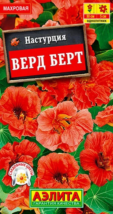 Великолепный сорт настурции с махровыми и полумахровыми цветками оригинальной окраски. Кусты компактные, высотой до 30 см. Листва темно-зеленая. Цветки Ø 4-5 см направлены вверх. Цветение раннее и продолжительное, до заморозков. Растения шикарно смотрятся в бордюрах и рабатках, на клумбах, в садовых вазах и балконных ящиках.