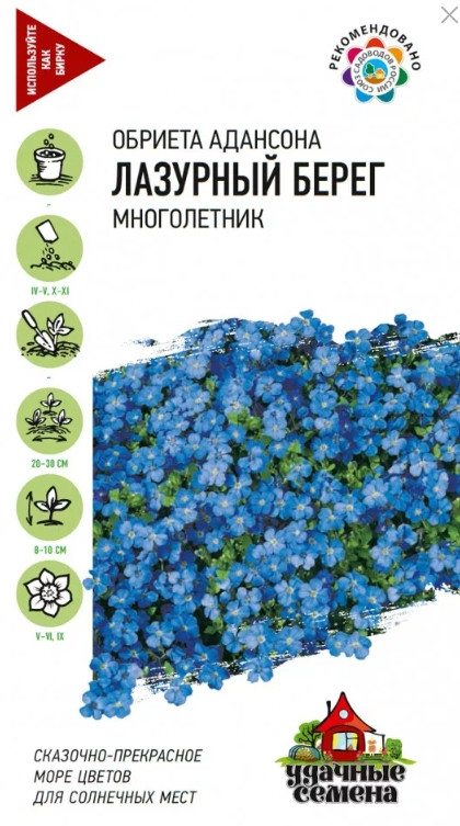 Крупноцветковая обриета - многолетнее растение, образующее распростертые куртинки до 8-10 см высотой, зимующие под снегом. Цветки до 1,5 см, сине-фиолетовые. Цветет в мае - июне, осенью наблюдается повторное цветение. Месторасположение только солнечное, даже в полутени обриета вытягивается и практически не цветет. Обриета предпочитает легкие, не слишком плодородные, некислые почвы. После майского цветения растения сразу обрезают, что способствует быстрому и более компактному росту. Отлично подойдет для создания альпинария.