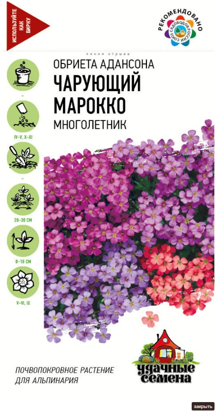 Крупноцветковая обриета -многолетнее растение, образующее распростертые куртинки до 8-10 см высотой, зимующие под снегом. Цветки до 1,5 см, разнообразной окраски. Цветет в мае -июне, осенью наблюдается повторное цветение. Месторасположение только солнечное, даже в полутени обриета вытягивается и практически не цветет. Обриета предпочитает легкие, не слишком плодородные, некислые почвы. После майского цветения растения сразу обрезают, что способствует быстрому и более компактному росту. Отлично подойдет для создания альпинария.