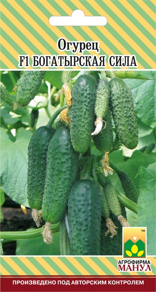 Огурец F1 Богатырская сила - скороспелый партенокарпический пучковый корнишонный гибрид женского типа цветения для весенних теплиц, тоннелей, открытого грунта. Хорошее отрастание боковых побегов (II тип саморегулирования ветвления) обеспечивает длительный период активного плодоношения. ОТЛИЧИТЕЛЬНЫЕ ОСОБЕННОСТИ: обилие завязей и зеленцов на растении, высокая стартовая партенокарпия. В узлах формируется от 2-4 до 6-8 и более завязей. Зеленцы овально-цилиндрической формы, длиной 8-13 см, диаметром 3,2-3,5 см, с часто-средним опушением. Вкусовые и засолочные качества высокие. Устойчив к оливковой пятнистости, вирусу обыкновенной огуречной мозаики, толерантен к ложной мучнистой росе и мучнистой росе.