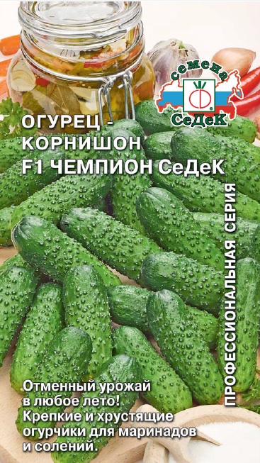 Среднеспелый (45-55 дней) партенокарпический (не требует опыления) гибрид для открытого грунта и пленочных укрытий. Растение среднерослое, слабоплетистое, с женским типом цветения и пучковым (по 2-4) формированием завязей. Зеленцы цилиндрические, крупнобугорчатые, выравненные, темно-зеленые с короткими полосами, длиной 10-12 см, массой 75-110 г, плотные, хрустящие. В период массового плодоношения формирует одновременно 30-40 плодов. Урожайность до 25-28 кг/м2. Ценность гибрида: устойчивость к заболеваниям и стрессам, стабильно высокий урожай даже в неблагоприятных условиях, продолжительный период плодоношения, прекрасные технологические качества корнишонов. Назначение универсальное.