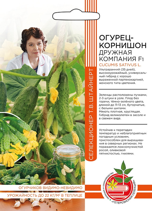 Абсолютно универсальный гибрид, приносящий высокие урожаи при любых способах возделывания. Плодовитость — дело рук учёных, создавших растение с выраженной партенокарпией (цветы на растении преимущественно женские). Завязи у огурца по 2–3 штуки формируют узлы. Чтобы пучки были солиднее, очень важно соблюдать агротехнику. Мучнистая роса, ложномучнистая роса, оливковая пятнистость, корневые гнили — об этом можно забыть, если вы выбрали Дружную компанию F1. А вот о рецептах заготовок зеленцов стоило бы побеспокоиться заранее. Ведь вкуснейшие, хрустящие, сладкие корнишоны, вырастающие до 11–13 см, хороши не только в свежем виде, но и в засоле! Эх, душистые, вкуснейшие зеленцы, да в дружной компании, да под водочку!.. Все-таки жизнь прекрасна!