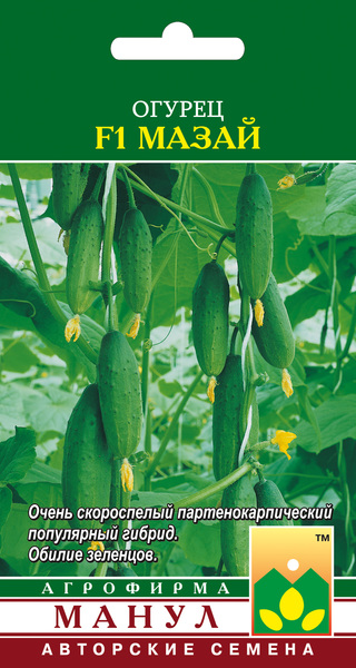 Огурец F1 Мазай - очень скороспелый партенокарпический гибрид женского или преимущественно женского типа цветения с комплексной устойчивостью к болезням. Предназначен для выращивания в весенних теплицах, тоннелях, а в более южных регионах — и в открытом грунте. Скороспелый, светолюбивый, стартовая партенокарпия высокая. Ветвление ограничено. Выделяется массированной отдачей урожая, одновременным наливом большого количества зеленцов на растении (до 6-8) без потери их товарных качеств. В узлах формируется по 1-2 завязи. Некоторые междоузлия могут быть сближены, отчего плоды на стебле выглядят как «гирлянды». Зеленцы бугорчатые, белошипые, со средним опушением, длиной 10-12 см; вкусовые и засолочные качества высокие. Гибрид устойчив к мучнистой росе, оливковой пятнистости, вирусу обыкновенной огуречной мозаики, толерантен к ложной мучнистой росе, корневым гнилям.