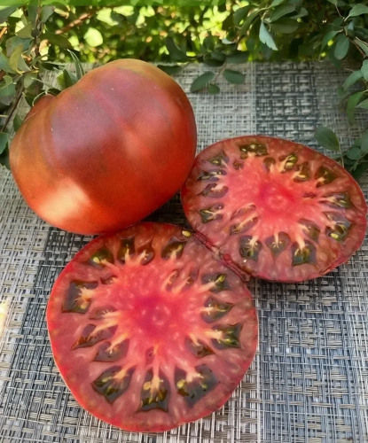 Высокорослый, среднеспелый, урожайный. Очень красивый и вкусный сорт. Мощный куст, длительное плодоношение. Плоды плоскоокруглые, с пышными плечиками, массой 250-450 г, пурпурно-малиновые, с золотистыми крапинками. Мякоть яркая, вишнёвого цвета, семена в зелёном геле. Сочные, ароматные, отличной консистенции, вкус сбалансированный, богатый. Суперсорт!
