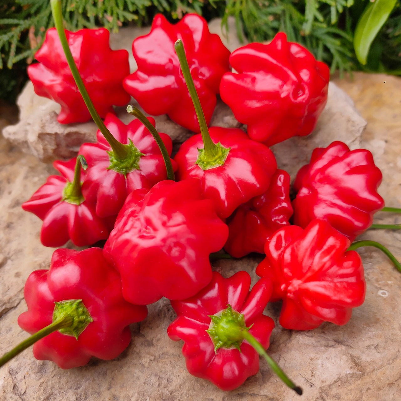 Известный сорт острого перца из Бразилии.Есть еще разновидности этого сорта с красными и желтыми стручками.Стручки необычной фантазийной формы, напоминающей морскую звезду. Растение высотой до 180 см со слабым боковым ветвлением. Лучше всего обрезать основные точки роста, чтобы вызвать боковое ветвление и сформировать более компактный куст.Сорт очень требователен к влагообеспеченности и требует более частого полива. В остальном это неприхотливый и урожайный сорт. Срок вегетации 180–190 дней при выращивании в теплице.Острота не больше 10 000 сковиллов.Вкус сладкий, аромат ягодно-фруктовый.Хорошо подходит для свежего потребления и для цельноплодного консервирования