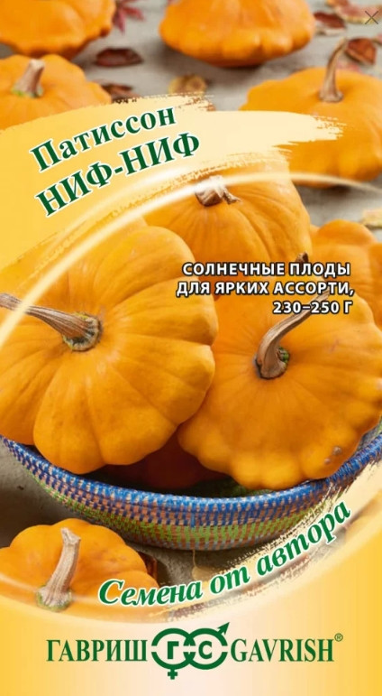Растение кустовое. Гладкие плоды тарелочной формы при созревании меняют окраску от ярко-желтой до оранжевой. Масса готовых патиссонов 230-250 г. Мякоть очень нежная, кремовая. Используют в домашней кулинарии: для тушения, запекания, маринования. Отличается хорошей лежкостью и устойчивостью к ложной мучнистой росе. Выращивают прямым посевом в грунт в конце мая-июне. На рассаду высевают в конце апреля. Хорошо отзывается на внесение органических удобрений.