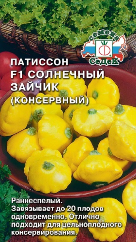 Раннеспелый (55-70 дней от полных всходов до технической спелости) сорт. Растение кустовое, главная плеть короткая. Лист среднего размера, зеленый, слаборассеченный, без пятнистости. Плод тарелочной формы, в технической спелости светло-желтый, глянцевый. Масса плода 280-500 г. Мякоть оранжево-желтая, плотная, малосочная. Вкус хороший и отличный.
