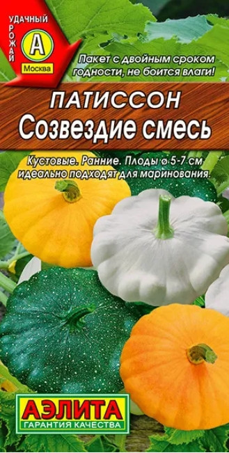 Содержит 35% семян сорта Сомбреро® (белоплодный), 35% семян сорта Карапуз® (желтоплодный) и 30% семян зеленоплодного сорта Сынишка®.