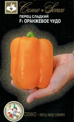 Перец сладкий Оранжевое Чудо F1 - ранний, высокорослый, крупноплодный гибрид с толстостенными, мясистыми плодами оранжевой окраски. От всходов до технической спелости плодов 100–110 дней. Растение мощное, с компактным габитусом, индетерминантное, при формировании в 2–3 стебля высота достигает 1,5–2 м. Перцы кубовидные, размером 11х11 см, в технической спелости темно-зеленые, в биологической спелости оранжевые, глянцевые, массой 200–220 г, толщина стенки плода 8–9 мм. Вкус перцев отличный, товарность высокая.Перец Оранжевое Чудо F1 устойчив к вирусу табачной мозаики (TMV 0–3) и бронзовости томата (TSWV). Хорошо переносит температурные стрессы и отличается высокой завязываемостью плодов. Урожайность в зависимости от условий выращивания 8–12 кг/м2.