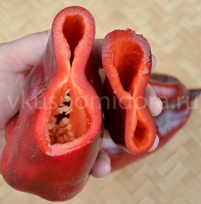 Очень вкусный, среднеранний, высота куста около 70см. Плоды в технической зрелости черные, в биологической — темно-красные. У всех имеется «клювик». Сами перчики среднего размера, их очень много, хорошо подойдут для еды и салатов. Приличная толщина стеночки. Мякоть хрустящая, сладкая.