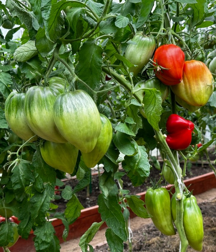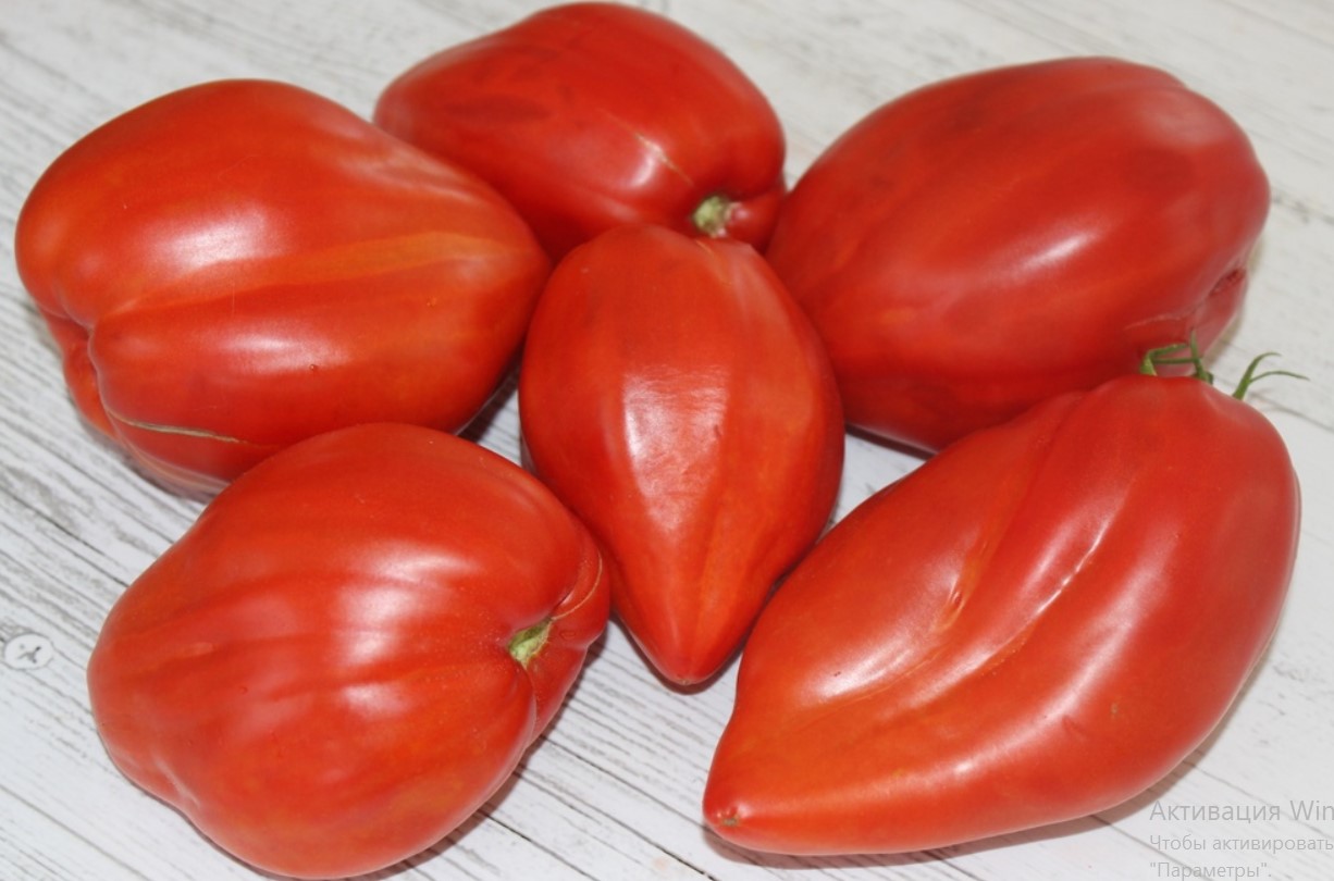 Роскошный крупноплодный сорт! Индетерминантный, среднеспелый сорт, куст крепкий с высокой продуктивностью, удерживает на себе большую массу крупноплодных томатов. Плоды весом 350-800 грамм, удлиненного сердцевидной формы с вертикальными гранями, мякоть плотная, малосемянная, вкусная, режется как стейки. Показал себя неприхотливым.