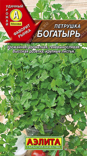 Позднеспелый, теневыносливый, листовой сорт (60-70 дней от всходов до уборки на зелень) для выращивания в открытом и защищенном грунте. Розетка крупная, высотой 25-40 см, формирует до 25 листьев. Листья темно-зеленые, с крупными долями, очень ароматные, хорошо отрастают после срезки. Рекомендуется для потребления в свежем, сушеном и консервированном виде. Урожайность – 3 кг/м2.