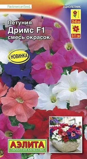 Новые гибриды американской селекции Дримс – отличный выбор для создания потрясающих воображение живых цветочных «ковров» или многоярусных «водопадных» цветников. Уникальность этой смеси петунии в насыщенности и выровненности оттенков очень крупных цветков Ø 8-11 см. Куст компактной формы, плотный, хорошо облиственный, высотой 25-40 см, диаметром 25-30 см. Аккуратная форма куста сохраняется весь сезон, несмотря на сильные дожди и ветра. Рекомендуется использовать гиб риды в составе садовых цветочных композиций или в качестве монокультуры. Контрастная смесь гибридов петунии подходит для оформления садовых вазонов, балконных контейнеров и подвесных кашпо.