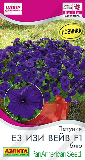 Инновационная эксклюзивная серия американской селекции «Е3 Изи вейв F1». Эти петунии объединили в себе лучшие свойства ампельных, крупно- и многоцветковых разновидностей культуры, что ранее казалось недостижимым. Растение образует очень густой полураскидистый куст ? 60-80 см (при высоте 15- 30 см). Благодаря целенаправленной селекционной работе цветение гибридов наступает уже при длине дня 9,5 часов и длится до устойчивых осенних заморозков, что значительно сокращает общие затраты при благоустройстве. Насыщенная цветовая гамма крупных цветков (? 6-8 см), необычная полуампельная форма, однородность и выносливость этих растений оставляют позади всех конкурентов. Серия одинаково роскошно выглядит в вазонах и подвесных кашпо, в виде ковровых посадок в цветниках.