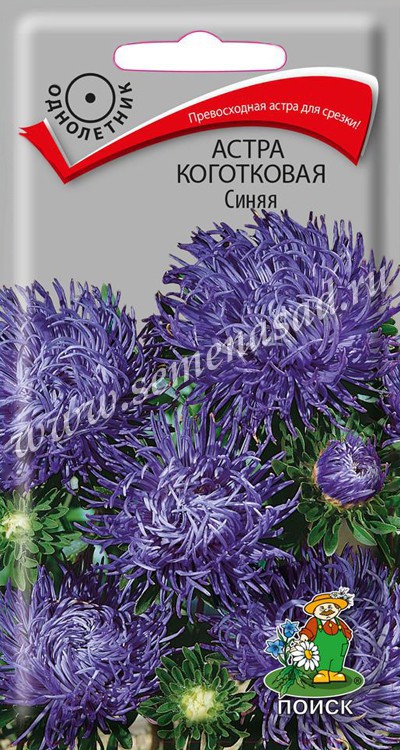 Превосходная астра для срезки! Куст узкий, букетной формы, прочный, высотой 75 см. На растении 12-15 махровых соцветий, диаметром 8-10 см. Окраска - синяя. Изогнутые внутрь и закрученные лепестки придают соцветию характерную коготковую форму. Цветение – август-сентябрь. Используют для посадки в сборные цветники группами, на рабатки – рядами и на срезку.