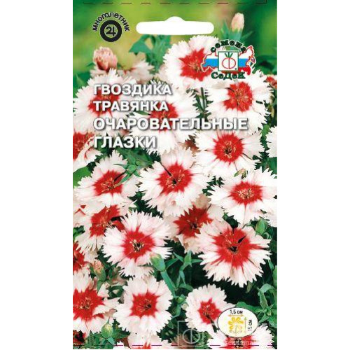 Гвоздика травянка «Очаровательные глазки» 0,1 г — это пакетик семян многолетнего почвопокровного растения с невысокими стелющимися стеблями и яркими ароматными цветами для солнечных мест, идеального для альпинариев, бордюров и декорирования дорожек, купленный на онлайн-площадках вроде Ozon или Wildberries. Это зимостойкий сорт, который легко вырастить из семян весной на рассаду или посевом в грунт, получая обильное цветение в июне-июле.