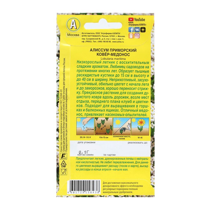 Семена Цветов Алиссум "Ковер-медонос", 0,05 г