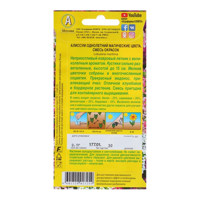 Семена цветов Алиссум "Магические цвета", смесь окрасок, О, 0,03 г