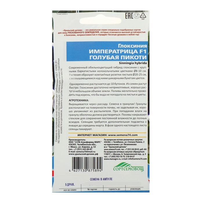 Семена цветов Глоксиния "Императрица", "Голубая Пикоти" , F1, 5 шт.