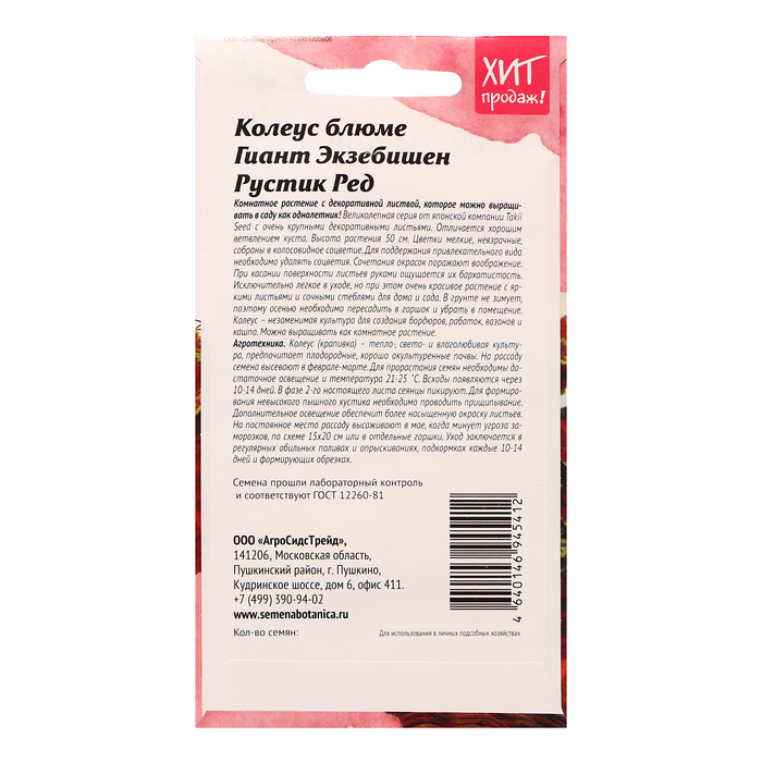 Семена Цветов Колеус блюме «Гиант Экзибишен Рустик Ред», 10 шт., «Агросидстрейд»