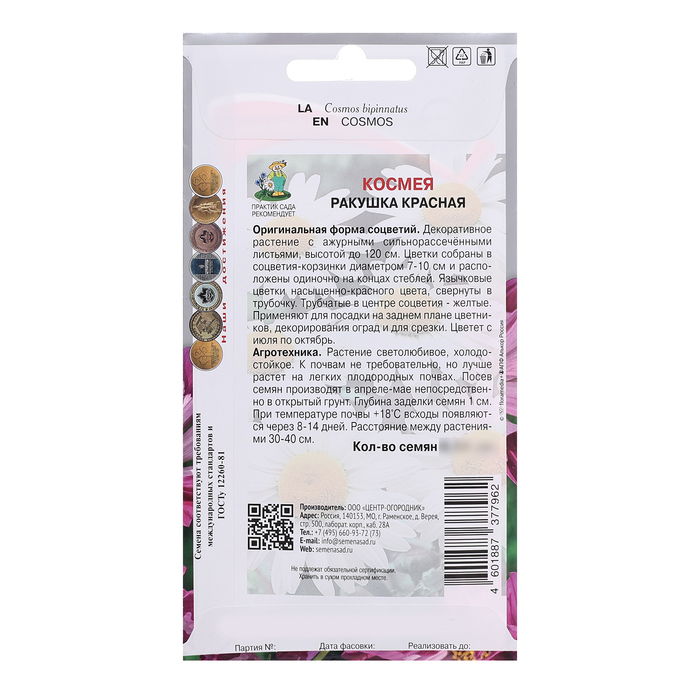 Семена цветов Космея "Ракушка", красная, 0,1гр.
