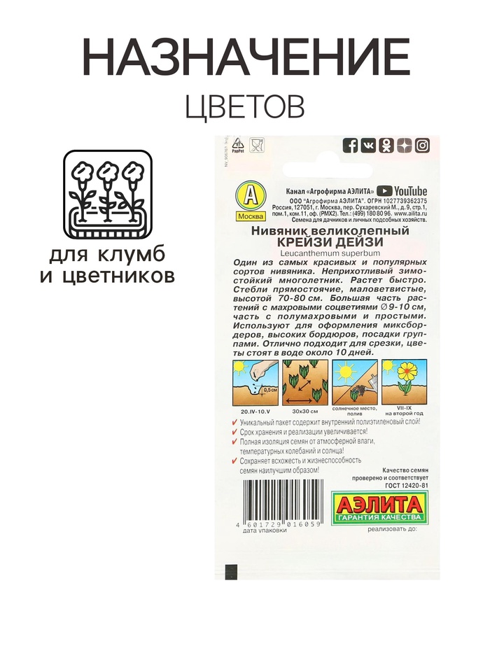 Семена цветов Нивяник "Крейзи Дейзи", махровый, Ц/П, 0,03 г г