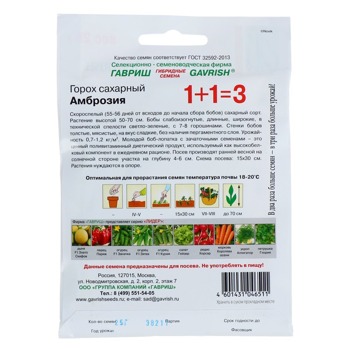 Семена Горох 1+1 «Амброзия», сахарный, 25 г, «Гавриш»