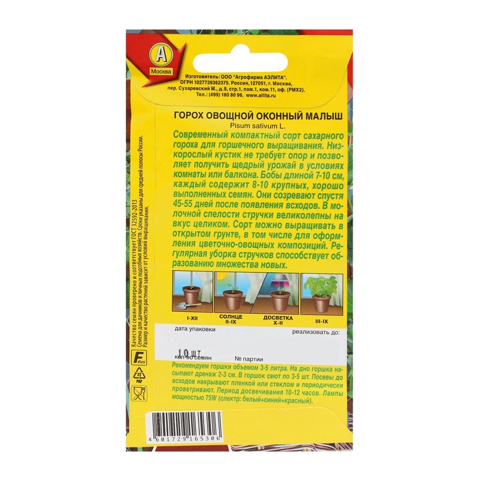 Семена Горох овощной сахарный «Оконный малыш», 10 шт., «Аэлита»