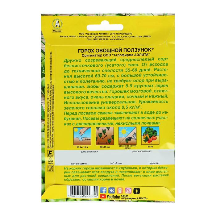Семена Горох овощной «Ползунок», лущильный, 25 г, «Аэлита»