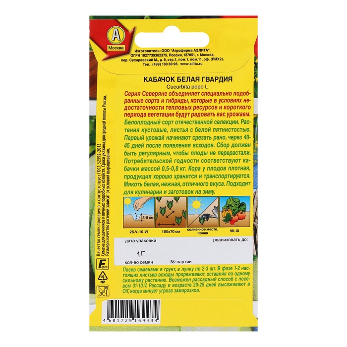 Семена Кабачок белоплодный «Белая гвардия», цветной пакет, 1 г