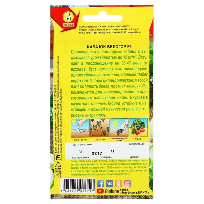 Семена Кабачок белоплодный «Белогор», F1, 1 г, скороспелый, «Аэлита»