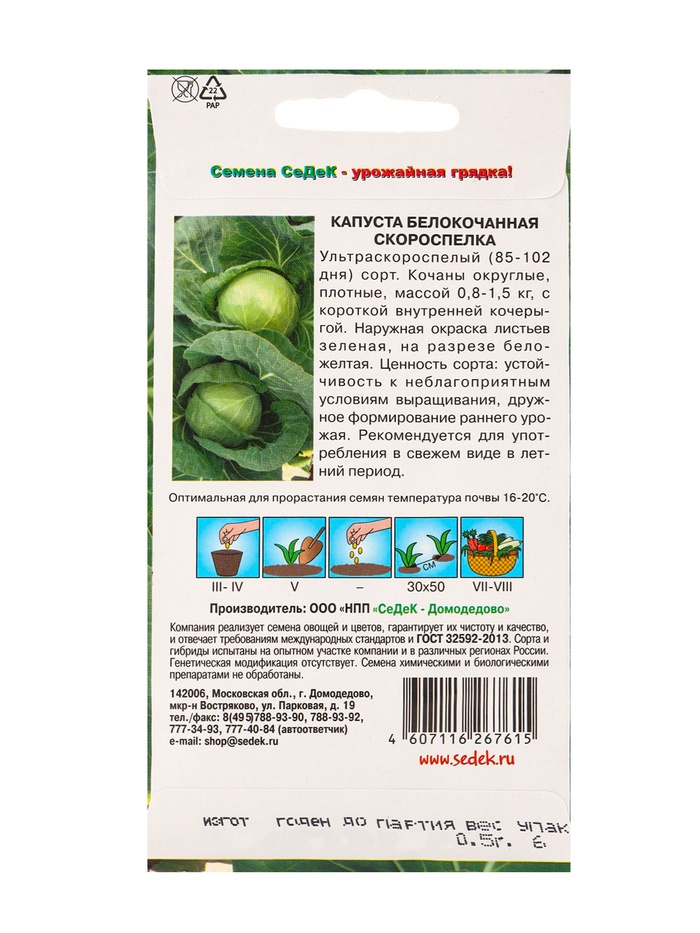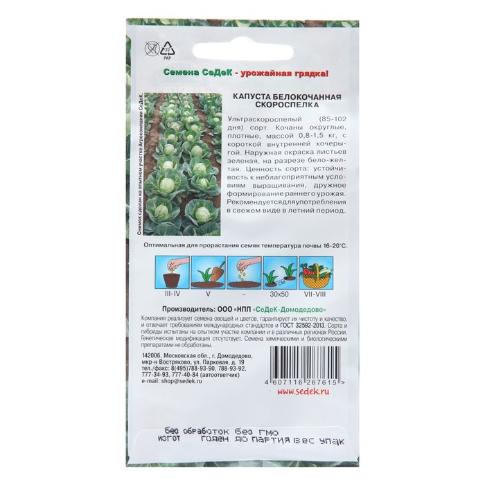 Семена Капуста белокочанная «Скороспелка», 0.5 г, «СеДеК»